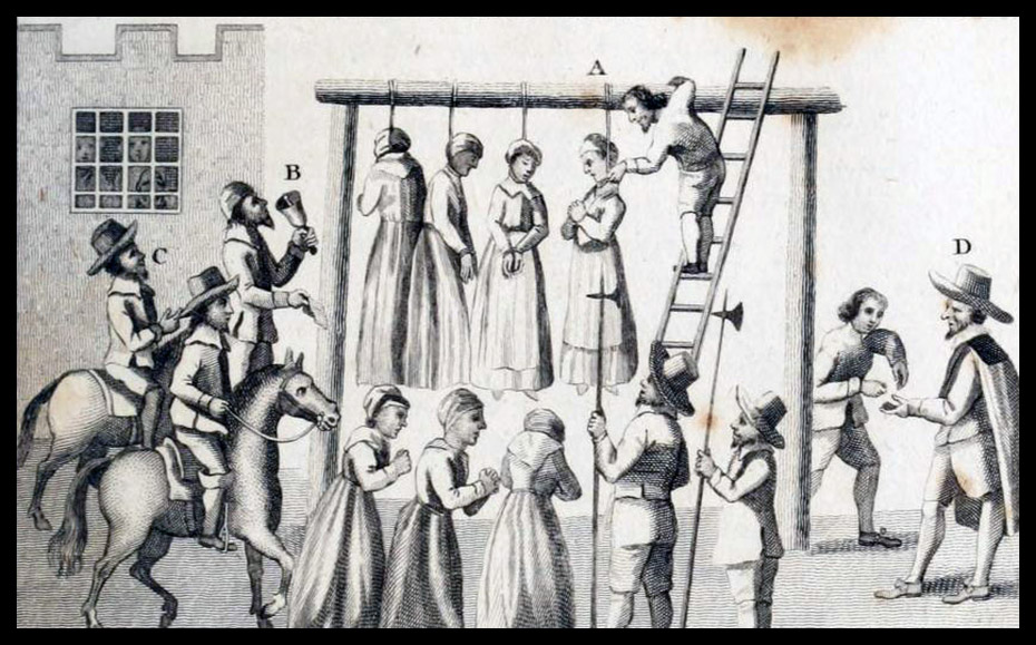 Image 1: Many Poor Women Imprisoned and Hanged For Being Witches from Ralph Gardiner’s England’s Grievance Discovered in Relation to the Coal-Trade: The Tyrannical Oppression of the Magistrates of Newcastle ; Their Charters and Grants ; the Several Tryals, Depositions, and Judgements Obtained against Them., a 1655 book on injustices in England’s coal industry, woodcut. The figures are identified as (A) Hangman (b) Bellman (C) Two fergeants (D) Witch-finder taking his money for his work.