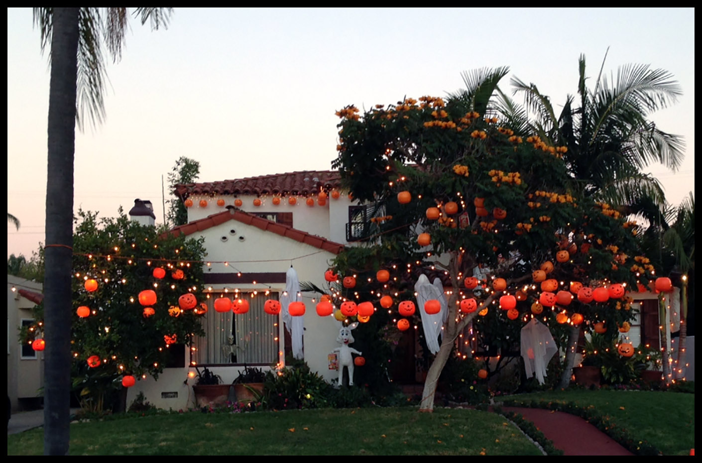 Spanish Colonial Revival Home Festooned for Halloween, San Diego, California is a site specific installation for the holiday. Here a mixture of commercially available Halloween decorative elements intermixed with hand crafted decorations completes the assemblage. Above the litany of jack-o-lantern trick-or-treating buckets strung ceremoniously from tree to tree intermixed with twinkly light affixed to palm tree, and translucent white ghosts is the African tulip tree’s orange blooms. The rabbits, while slightly unexpected, hold candy buckets as a trick-or-treater might. This whimsical decoration spreads onto the neighbor’s property, thus fostering community. In America, many traditions have added to the vast vocabulary of imageries and practices associated with celebrating Halloween. Today, there are even Halloween Haiku contests for children and dinner parties that could trace their origins to France or Italy autumnal feasts showing the multitude of influences on the contemporary celebration of Halloween.[xi]