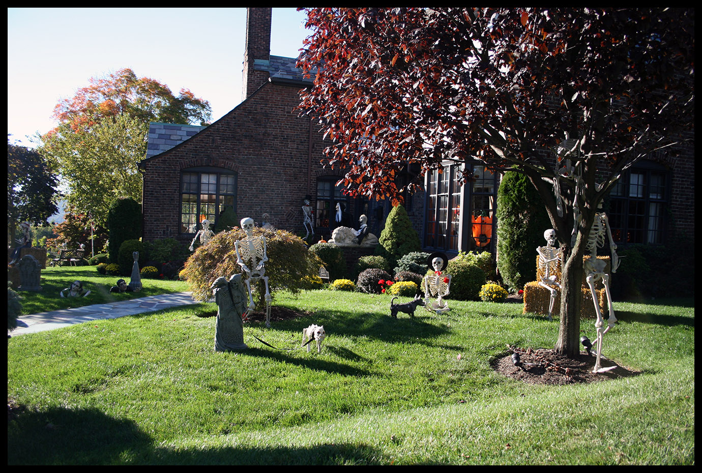 Tudor Home Festooned for Halloween , Westchester, New York, 2014 is an example of elaborate house decoration. Here the home owners have creatively assembled commercially available elements into an unique and inviting environment for their potential young visitors. Zombies emerging from the lawn, tomb stones, hay bails, and no less than twelve skeletons, some with their skeleton dogs, comprise this site specific installation. The home owner posed the skeletons in humorous and engaging stances.