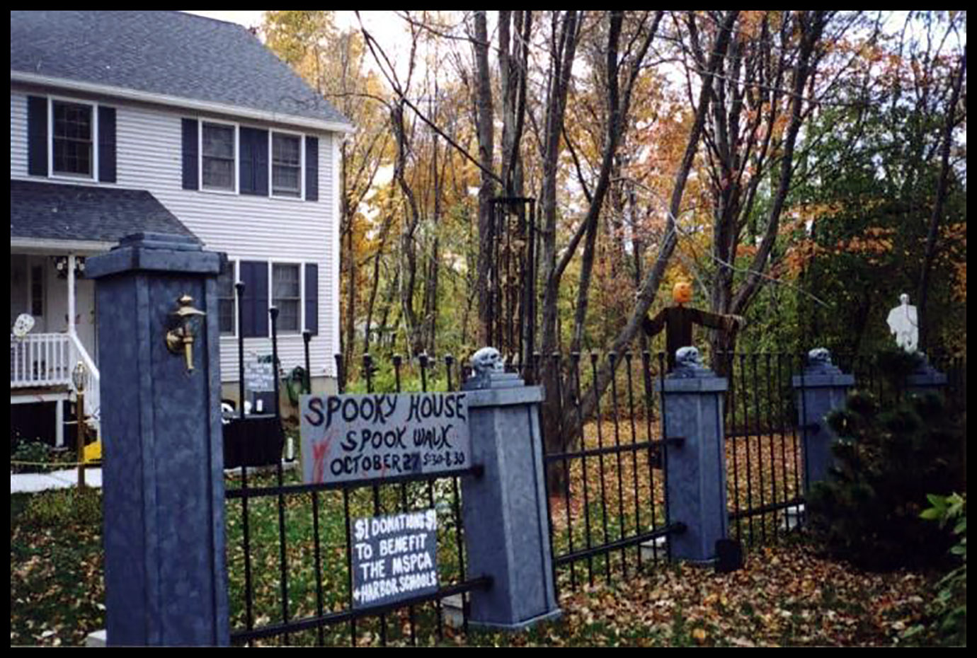 The creative process, the time and the energy put into these house decorations shows thoughtfulness, community involvement, and in the case of the creator of Spookmaster, an opportunity to support a charity. The raising of funds for her local ASCPA one year through attendance of her Halloween installation is a clear demarcation of community involvement. Since The Folk Art of Halloween was first researched and presented, Spookmaster, now called Spooky House, has grown to involve at least 30 people, both children and adults. The home owners who festoon their home have moved and continue to move Spooky House with them. The front fence of Spooky House shows both the papier-mâché skull heads on columns and a sign reading, “$1 DONNATIONS TO BENEFIT THE MSCPA HARBOR SCHOOLS”. This illustrates that individual home owners festooning their home become folk artists for Halloween, and in addition make it into a philanthropic event. In this, the folk art of Halloween brings communities together.