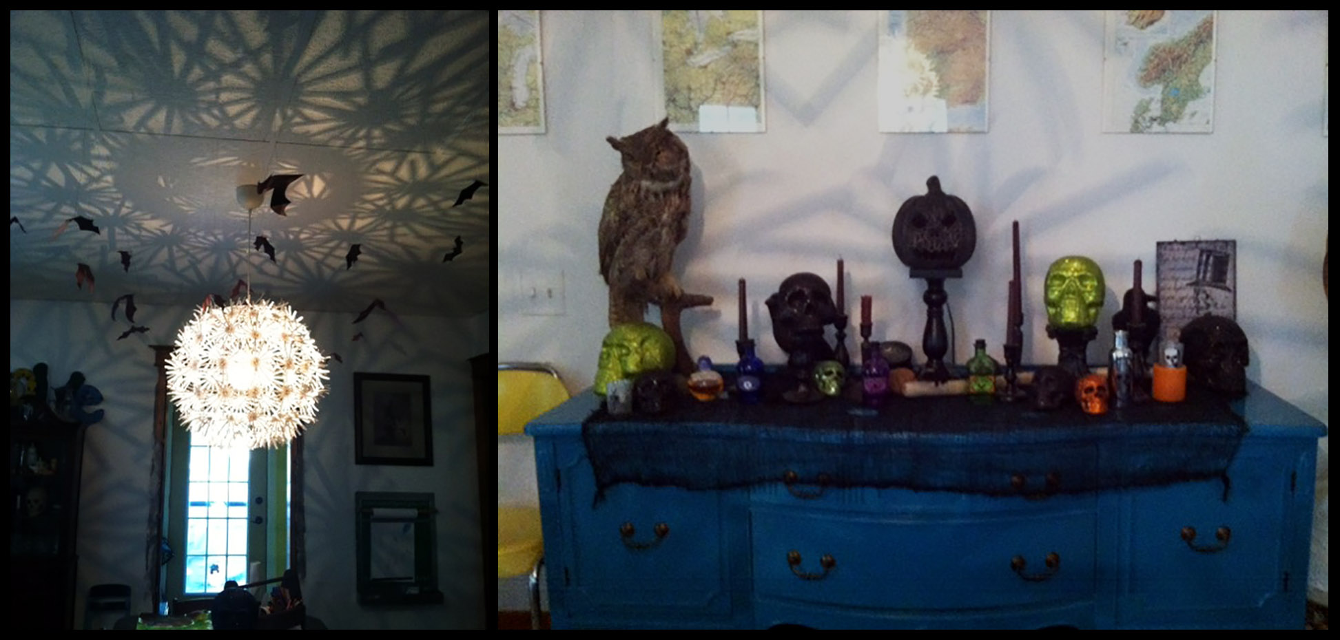 A dining room in Rochester, New York comes alive with bats realized in black construction paper and wire each Halloween. While not part of historic visual vocabulary associated with Halloween, because bats are nocturnal and associated in popular culture with Bran Stoker’s 1897 Dracula, they are a logical addition to Halloween tropes in the twentieth century. The hand crafted bats circle the ceiling above the sideboard festooned with skulls, a jack-o-lantern, and an owl.
