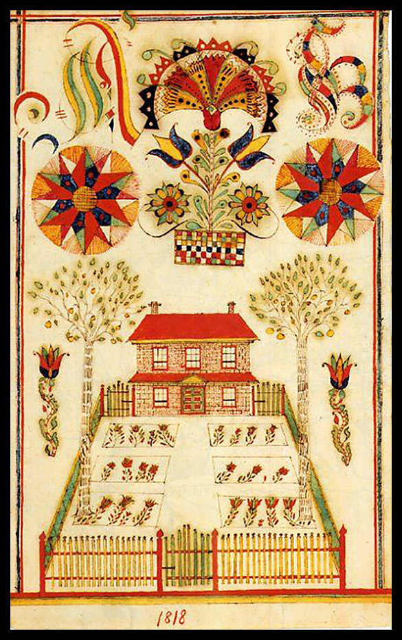 Image 2: House with Six-Bed Garden, Fraktur for Abraham Heebner Susanna Heeber (1750-1818) watercolor and ink on laid paper, 1818 Collection of the Schwenkfelder Library & Heritage Center