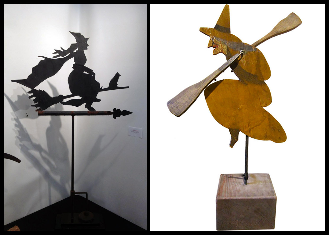 More canonized forms of American folk art have incorporated imagery associated with Halloween. A late nineteenth century wool quilt and hand hammered tin lanterns from the turn of the twentieth century, used in America for Halloween parades, bear the imagery of the jack-o-lantern. A witch silhouetted on the moon appears on a hooked rug from Maine, dating from the 1920’s. While a whirligig, a celebrated whimsical American folk art form, is realized as a witch painted with an orange skirt, cape, and conical hat, a weather vane depicts a witch on broom stick with cat. Here the cut metal weathervane shows the witch’s cape and hair windblown. The utilization of the vocabulary associated with Halloween permeating traditional American folk art forms allows for seasonal decoration of homes where art collections are rotated.