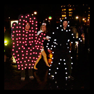 The subcategory of folk art costume, drawing from technologically advanced concepts as muse, is particularly engaging because of the beautiful tension between technology and craft. These include folk art costumes of robots, vehicles, social media, a typewriter (where a group of friends each wore a hand written symbol of the different typewriter keys on 8” x 10”pieces of construction paper that were affixed with string to hang like a necklace over each person’s clothes) , and a cross walk sign, for example. Cross Walk Sign, a singular work, comprised of two elements is worn by two people. The costume is cutout and painted cardboard hand, embellished with red battery operated LED lights, forming the “DON’T WALK” element of the signage, and black street clothes, embellished with white battery operated LED lights, forming the “WALK” element. The manufacturing of crossing signs is reliant upon industrial production; their success is valued by their physical longevity. In contrast, the temporal costume that uses this technological concept as muse is valued by its clever execution.
