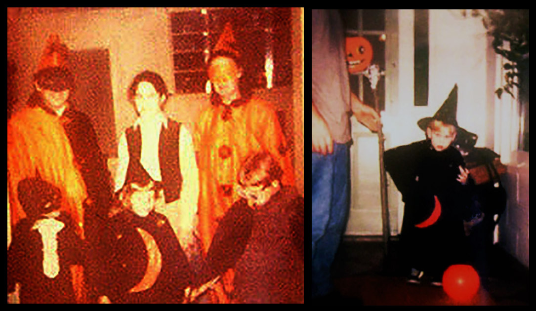 Halloween costumes are designed, realized, and worn by people of all ages. Customarily, children dressed as goblins and ghosts on Halloween so that they would not be discovered by the perceived real goblins and ghosts lurking about on All Hallows’ Eve.[ix] Other popular costumes include pumpkins, witches, cats, and owls. Children’s Halloween costumes can embrace the traditional aforementioned imagery associated with Halloween, or endless possibilities of themed costumes drawing from delightfully unexpected sources. These costumes transform parents with no training or expertise in the arts into sculptors in their own rites. Many parents spend hours creating costumes for their children. The costume, Witch, was made so well that another child can be seen wearing the same costume 21 years later as Warlock. The costume of black wool with a crescent moon and gold star applique associates the imagery of the Halloween witch with night.