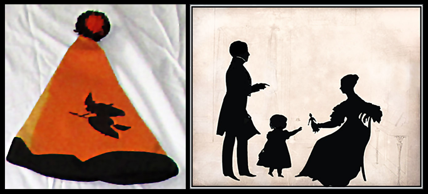 The preservation of these costumes proves fascinating with the appearance of the black paper cut silhouettes accenting both the one piece jump suits and hats. These paper silhouette embellishments usurp their form from the conventional portrait silhouettes. Eighteenth and nineteenth century silhouette portraits simultaneously portray images of the sitters elegantly and distinctly while leaving details ambiguous. The absence of color and detail allude to the sitters having a greater narrative than what is revealed. The silhouettes on Halloween Clowns feature Halloween tropes including witches on broomsticks, cats, and jack-o-lanterns. The use of silhouette for this group of Halloween costumes is particularly effective in conveying the mood of the unknown. Therefore the use of silhouettes fits into the Halloween iconography seamlessly.